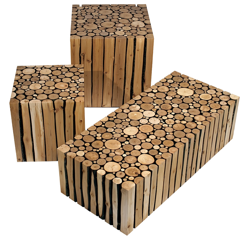 代表的なアルダーコレクションは、通常は利用されることがないアルダーの細い幹や枝からできています。森を切り開いた送電線の敷地に次々と生えてきて、定期的に伐採されているものです。この地で真っ先に育つ広葉樹のアルダーは、ほかの樹木が育つための環境を整える役割を果たしています。彼はアルダーの役割を深く理解し、廃棄されていたアルダーの小径木を活用する方法を考えたのです。