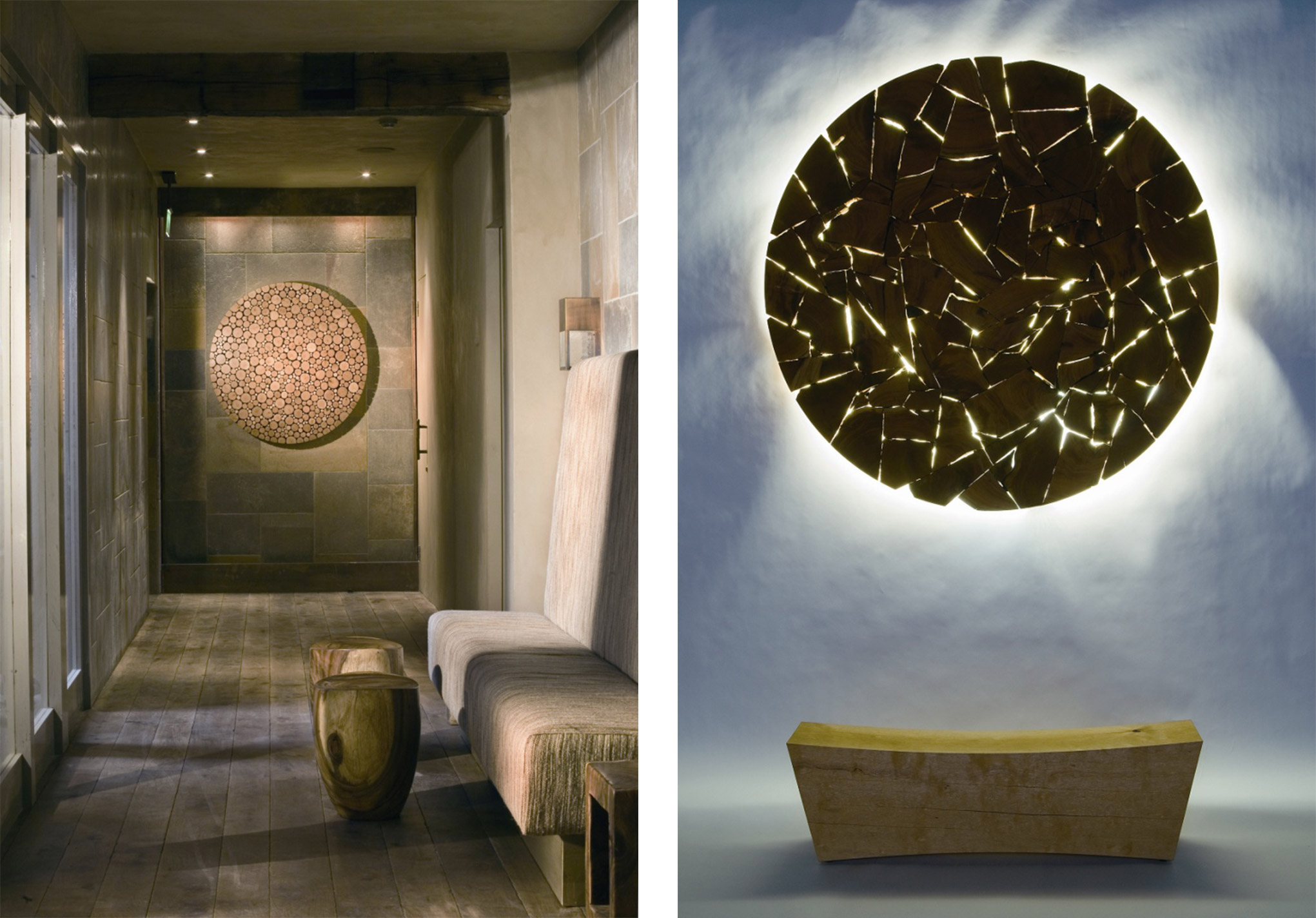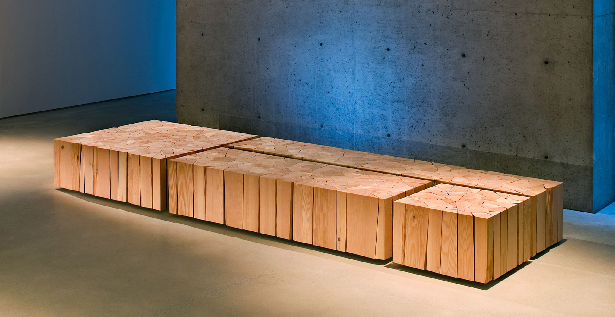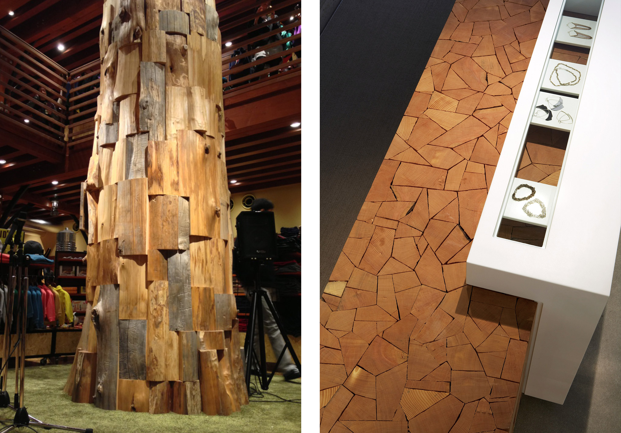 彼がもっともよく使う素材が木材です。彼の創作の源は、100年前にバンクーバー近郊で林業に携わっていた曾祖父の時代にまでさかのぼります。カナダ太平洋沿岸は独特の気候によって巨木が生育する世界的にも珍しい地域で、バンクーバーはこの豊富な木材資源を活用した林業によって栄えてきました。彼の一族の歴史はそのままバンクーバーの歴史と重なり、彼にインスピレーションを与えます。